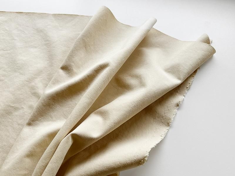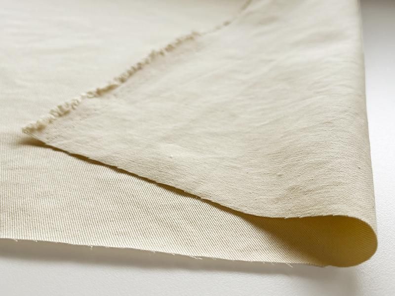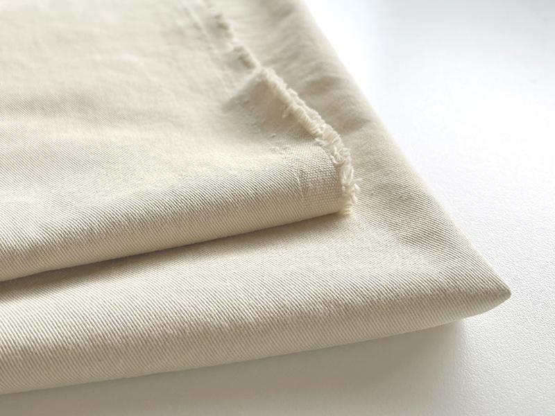 やや厚手です。ごく一般的なチノクロス(20番手程度)より、少し厚手です。